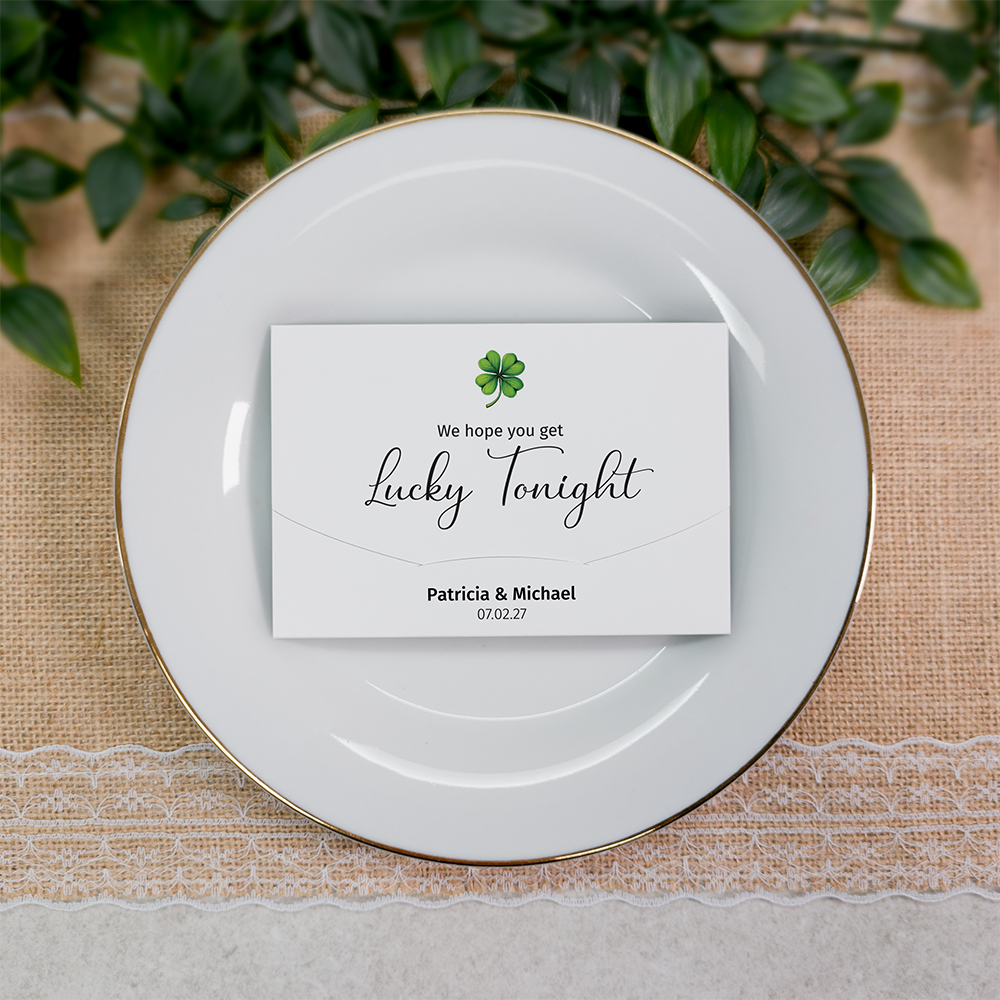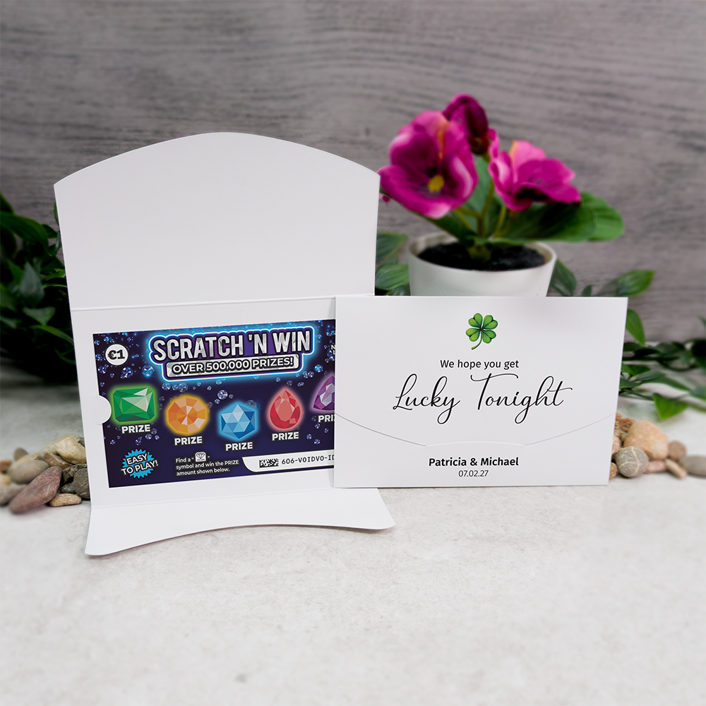 These cute little wallets/envelopes are ideal for holding scratch cards used as wedding favours. The holders measure 11.6cm x 8cm (approx 4.5" x 3.1") when closed and are designed to take a 4" wide scratch card with a height up to an including 3" high. This covers most Irish €1/ US $1 and UK £1 scratch cards.