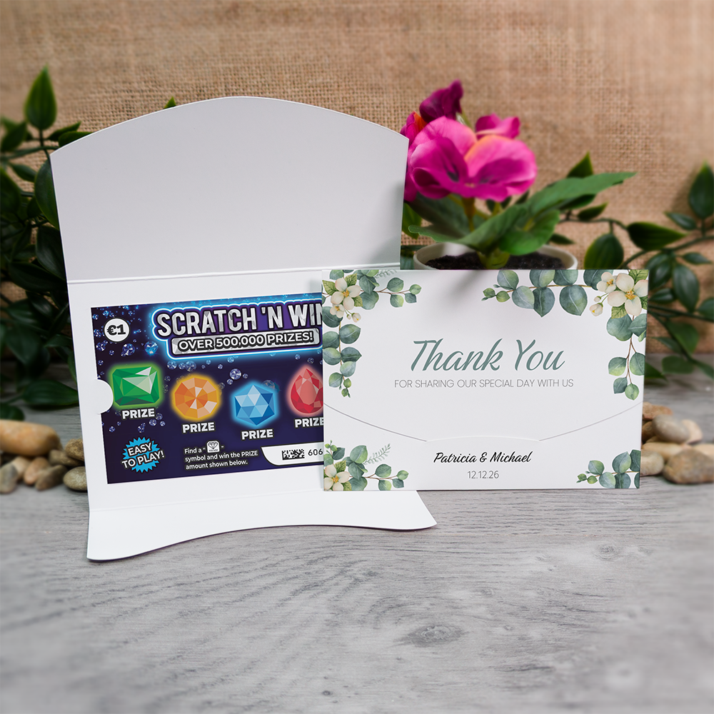 These cute little wallets/envelopes are ideal for holding scratch cards used as wedding favours. The holders measure 11.6cm x 8cm (approx 4.5" x 3.1") when closed and are designed to take a 4" wide scratch card with a height up to an including 3" high. This covers most Irish €1/ US $1 and UK £1 scratch cards.