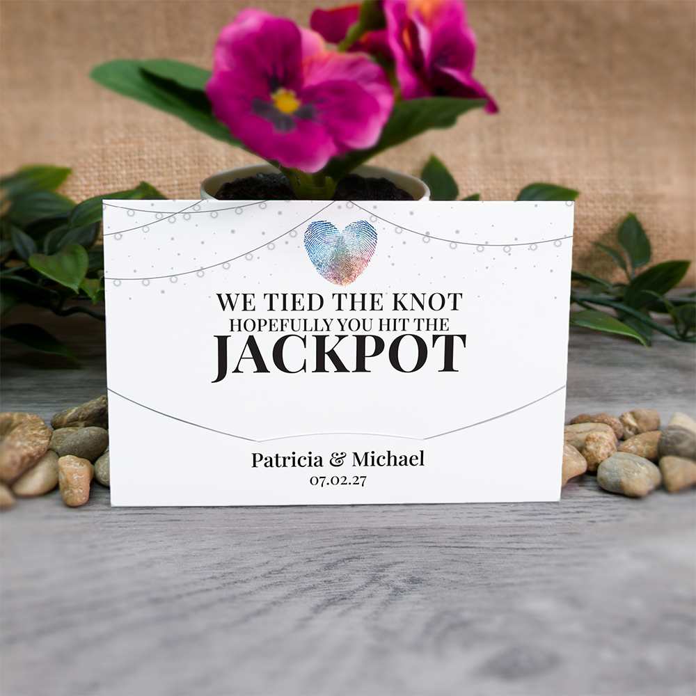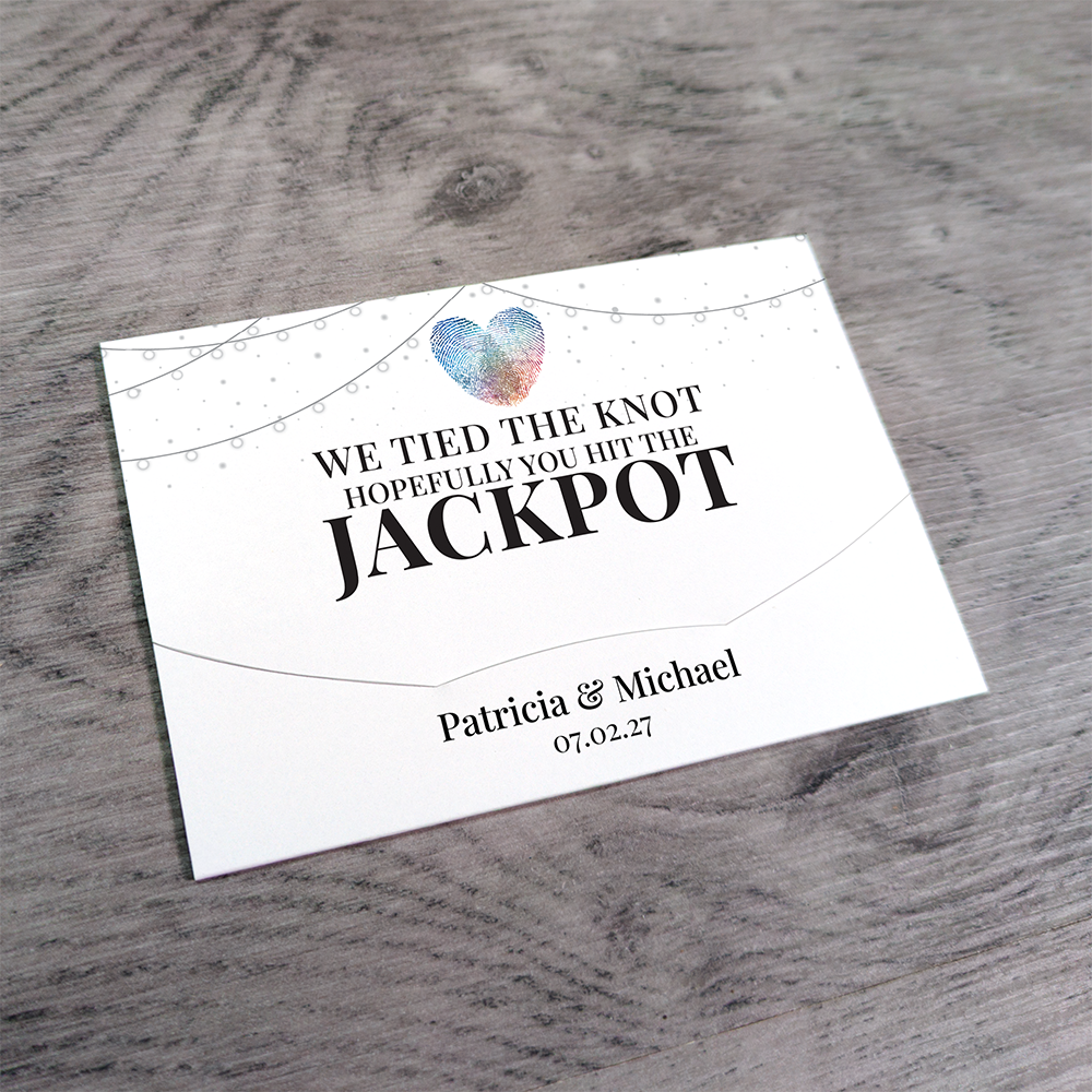 These cute little wallets/envelopes are ideal for holding scratch cards used as wedding favours. The holders measure 11.6cm x 8cm (approx 4.5" x 3.1") when closed and are designed to take a 4" wide scratch card with a height up to an including 3" high. This covers most Irish €1/ US $1 and UK £1 scratch cards.