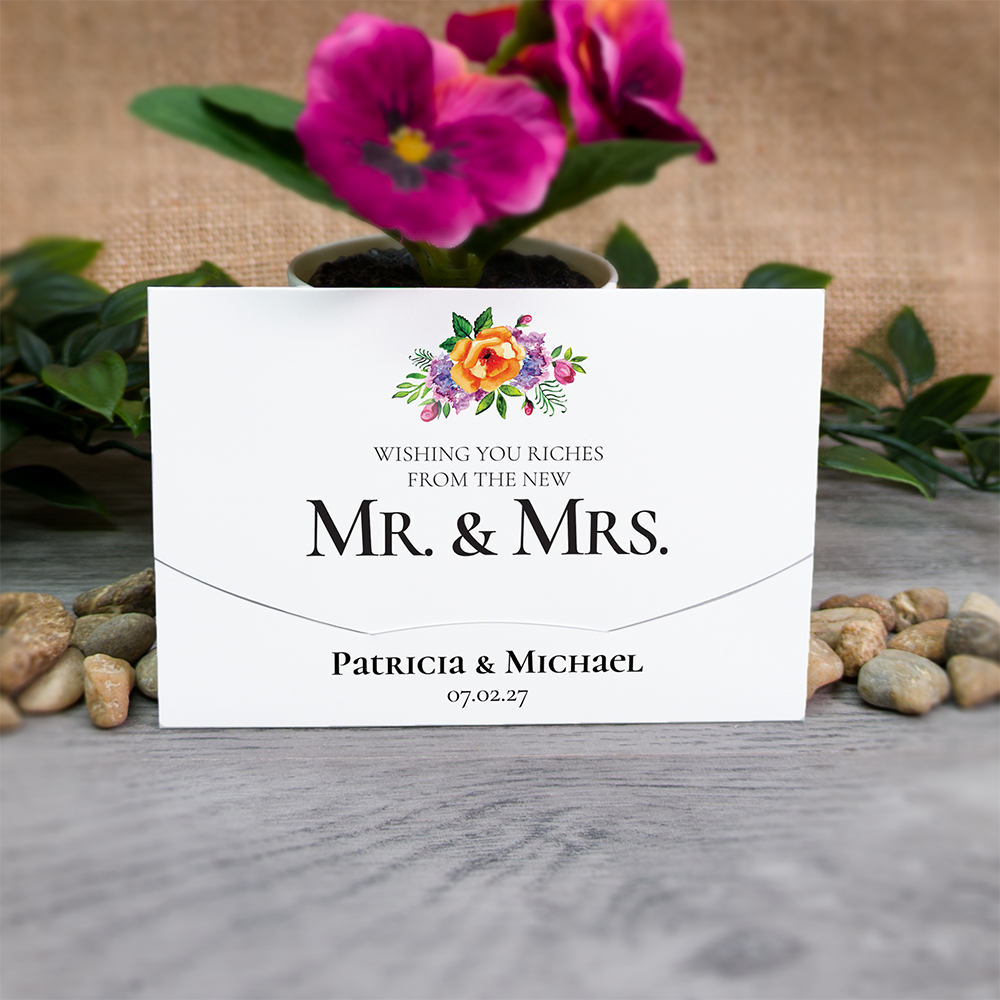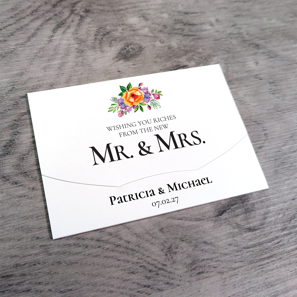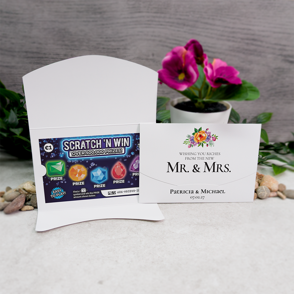 These cute little wallets/envelopes are ideal for holding scratch cards used as wedding favours. The holders measure 11.6cm x 8cm (approx 4.5" x 3.1") when closed and are designed to take a 4" wide scratch card with a height up to an including 3" high. This covers most Irish €1/ US $1 and UK £1 scratch cards.