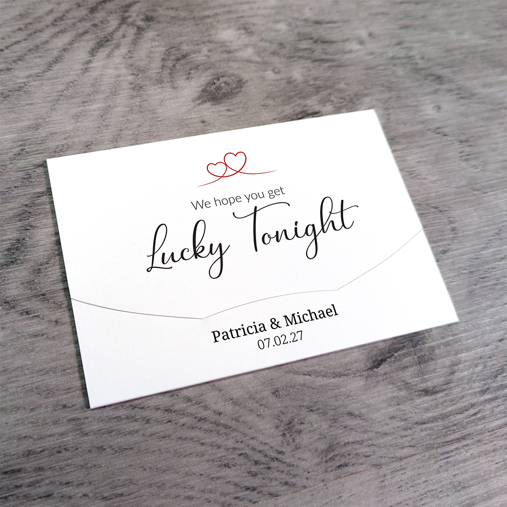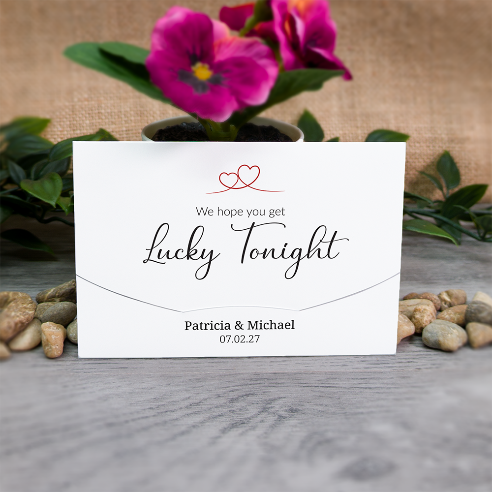 These cute little wallets/envelopes are ideal for holding scratch cards used as wedding favours. The holders measure 11.6cm x 8cm (approx 4.5" x 3.1") when closed and are designed to take a 4" wide scratch card with a height up to an including 3" high. This covers most Irish €1/ US $1 and UK £1 scratch cards.