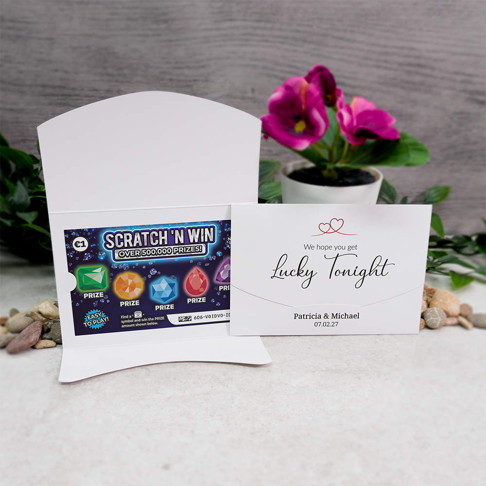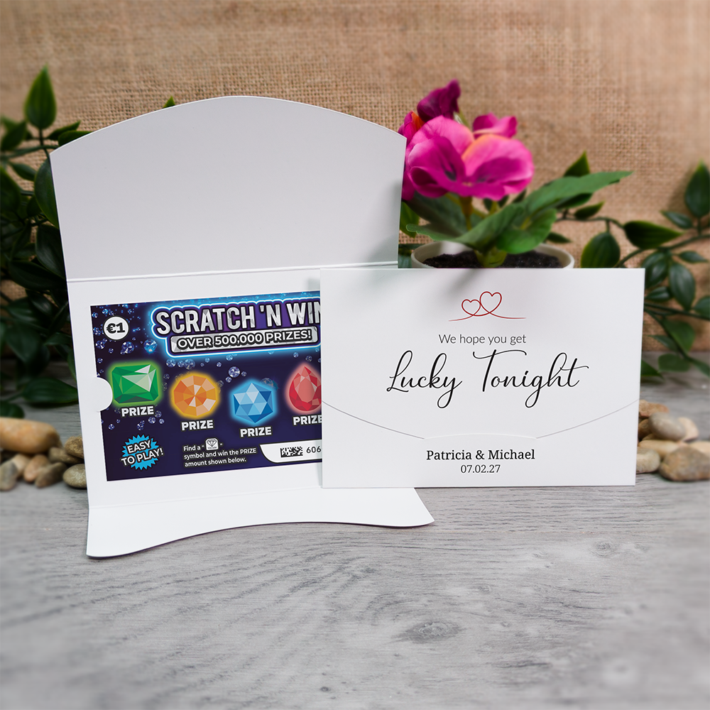 Printed on a heavyweight 300gsm silk card, the holders have flaps to hold your scratch card securely without having to resort to using glue or tape. They are supplied pre-creased and ready to be folded.
