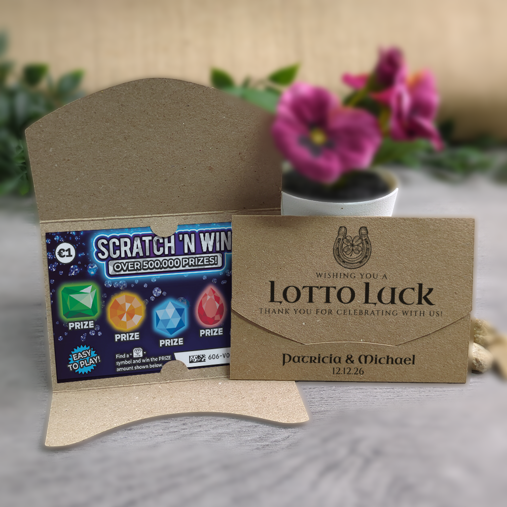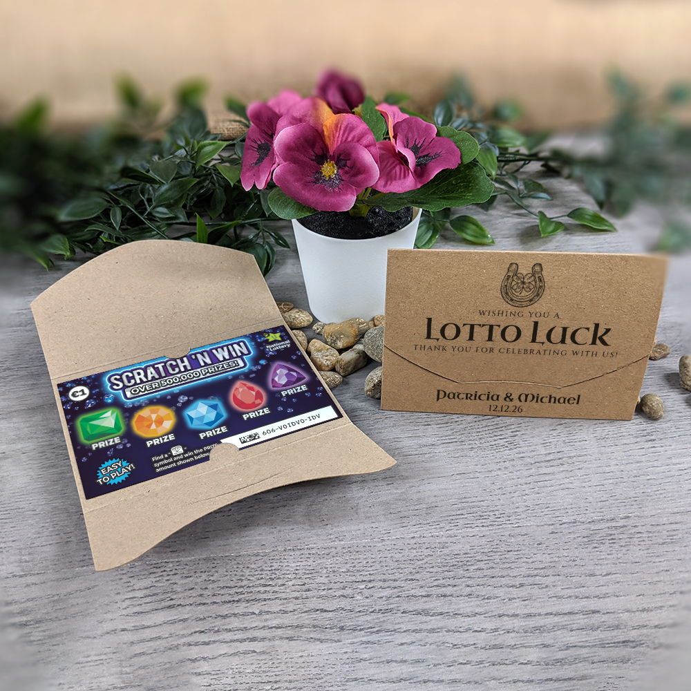These cute little wallet/envelopes are perfect for presenting scratch cards used for wedding favours for your guests. Available in 3 different sizes which accommodate a range of scratch cards sizes. If you don't see your size listed, please get in contact for a custom size.