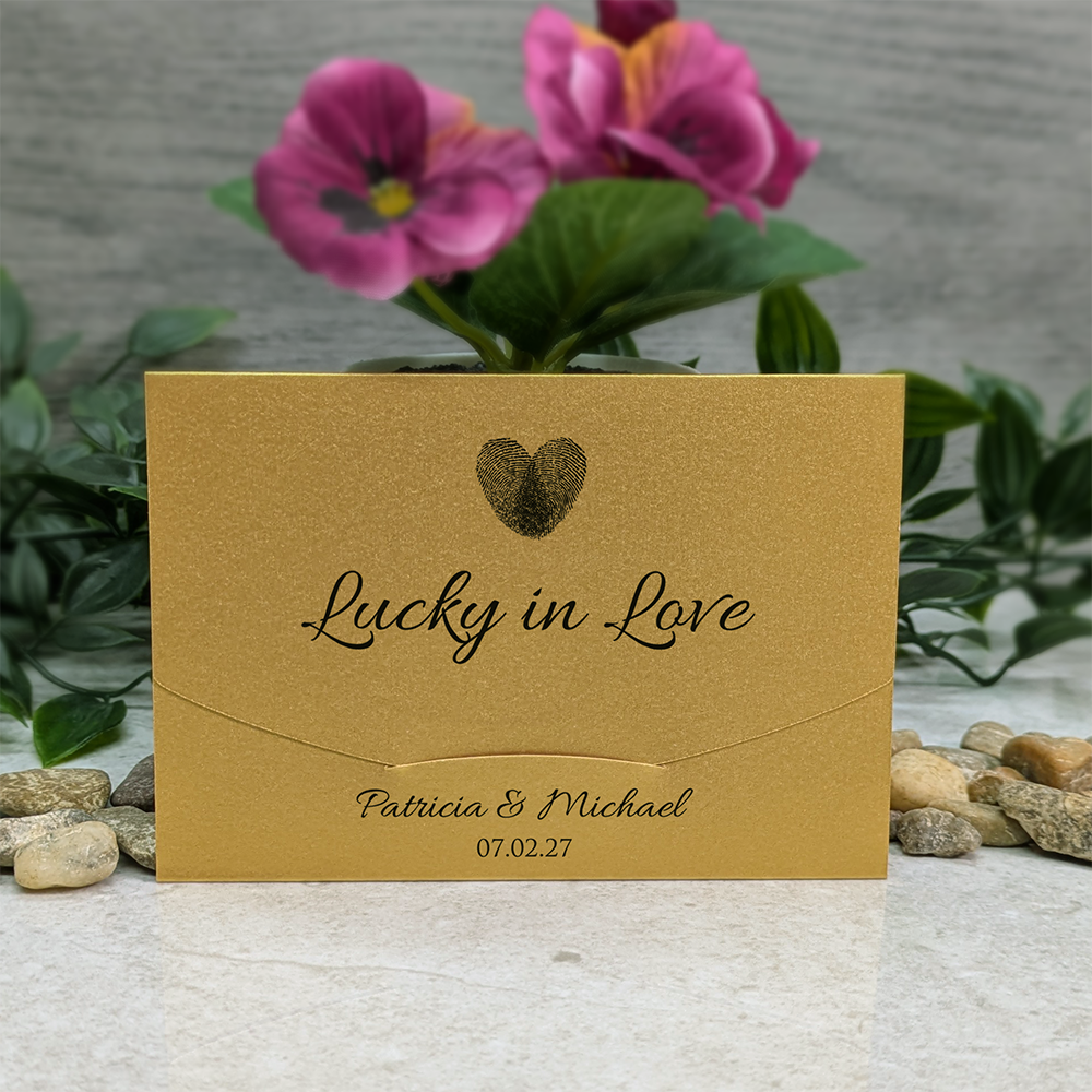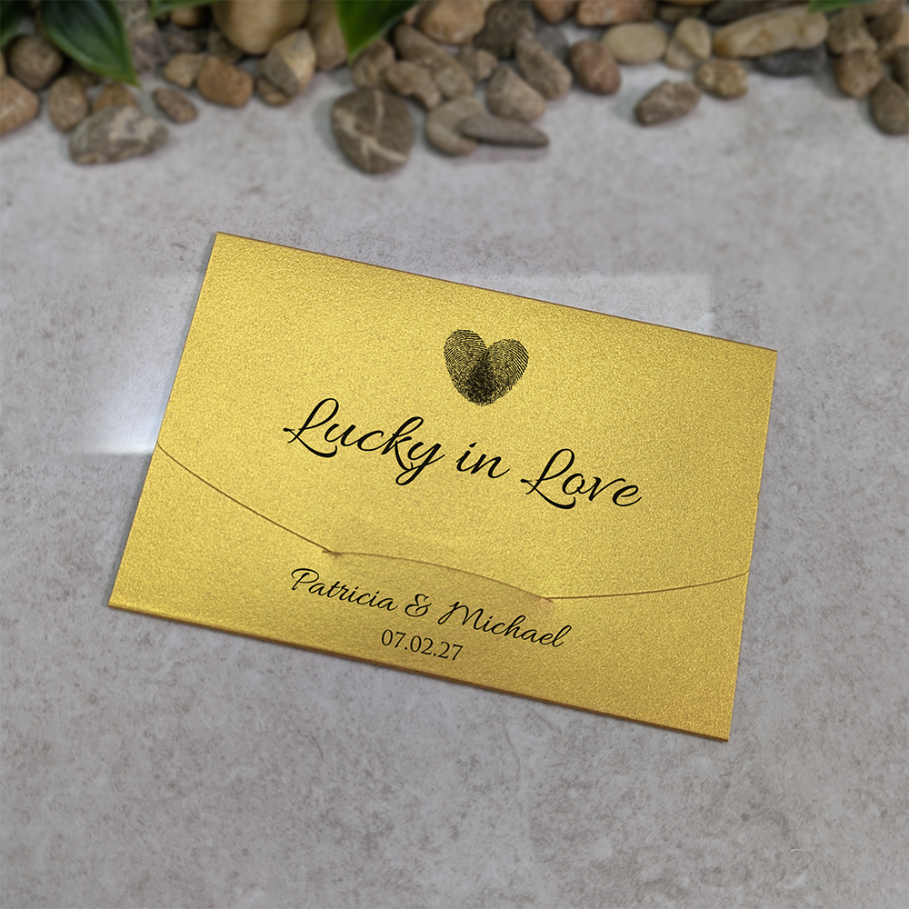 These cute little wallets/envelopes are ideal for holding scratch cards used as wedding favours. The holders measure 11.6cm x 8cm (approx 4.5" x 3.1") when closed and are designed to take a 4" wide scratch card with a height up to an including 3" high. This covers most Irish €1/ US $1 and UK £1 scratch cards.