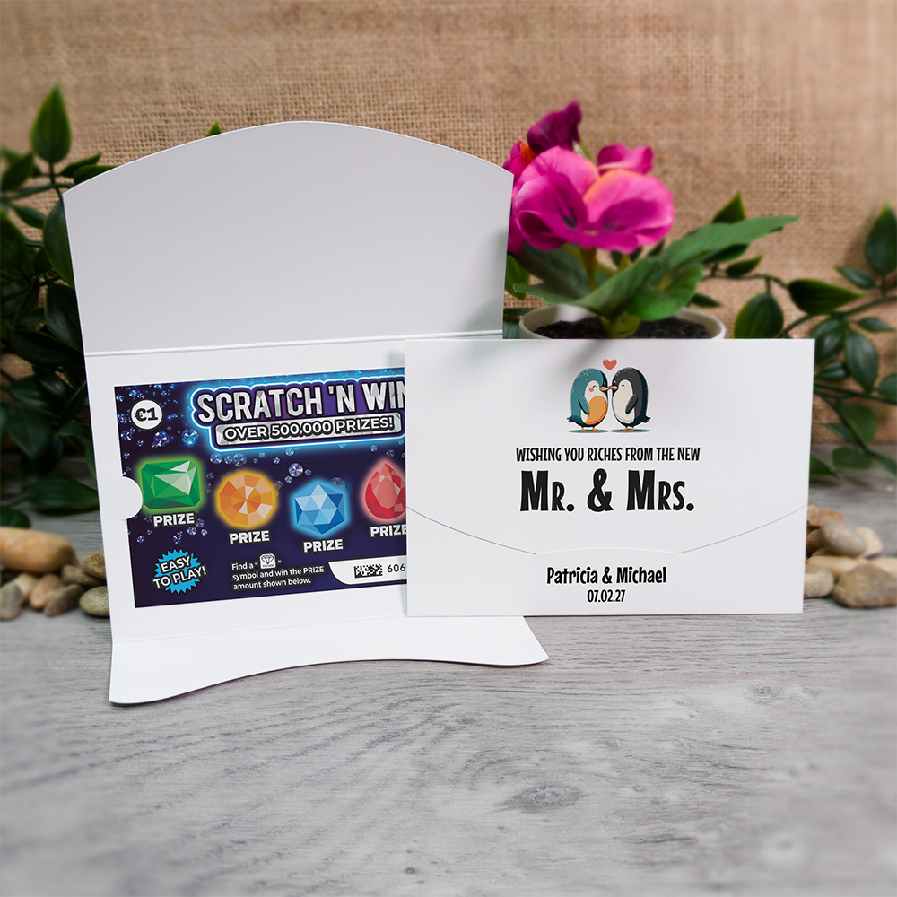 Printed on a heavyweight 300gsm silk card, the holders have flaps to hold your scratch card securely without having to resort to using glue or tape. They are supplied pre-creased and ready to be folded.