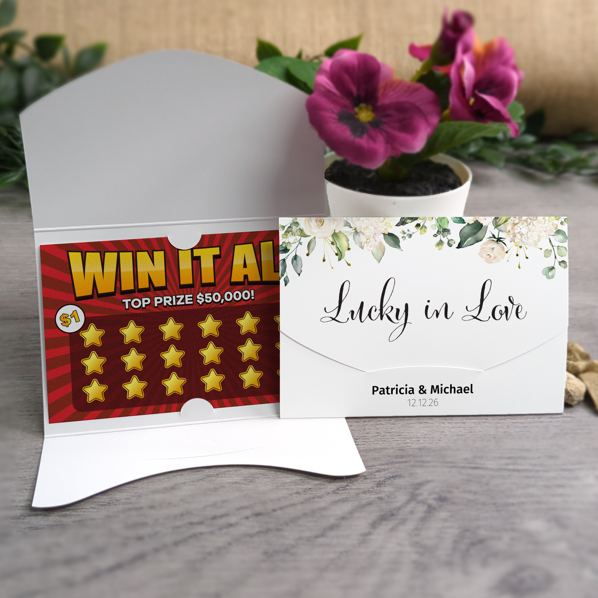 These cute little wallet/envelopes are perfect for presenting scratch cards used for wedding favours for your guests. Available in 3 different sizes which accommodate a range of scratch cards sizes. If you don't see your size listed, please get in contact for a custom size.